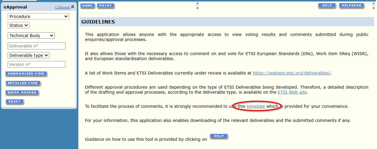 Comments shall be submitted using the ETSI dedicated ENAP or SRdAP comments and resolution report template. The template is available on the online e-Approval application home page (see figure 1) or on the ETSI NSOG or NSBG Portal page. See clause 4.2.3 for more details.